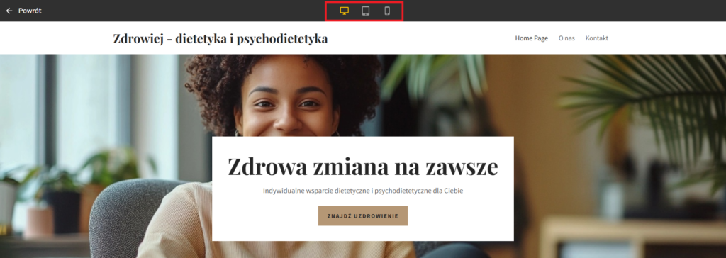 - Podgląd – pozwala Ci zobaczyć, jak Twoja strona będzie prezentowała się na różnych urządzeniach.