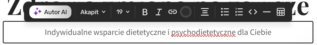 W górnej belce kliknij Dodaj zawartość, a następnie Dodaj widżet. „Złap” Tekst i przeciągnij w pożądane miejsce na stronie. Zostanie tam dodane pole tekstowe. Po kliknięciu go, możesz wprowadzić tekst. Wyświetli się także belka z narzędziami formatowania. Możesz też skorzystać z Autora AI – dzięki tej funkcji Ty opisujesz, jaki tekst chcesz umieścić w polu tekstowym, a sztuczna inteligencja pisze go za Ciebie. Dowiedz się więcej o działaniu funkcji AI w Kreatorze.