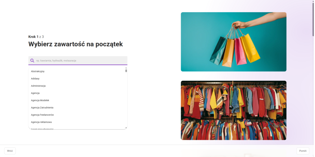 Jeżeli zdecydujesz się na ręczny wybór szablonu, na początku zobaczysz listę – wybierz z niej branżę, tematykę, której będzie dotyczyć Twoja strona. Po lewej stronie zobaczysz zestawy pasujących grafik – wybierz ten, który odpowiada Ci najbardziej (potem możesz je zmienić).