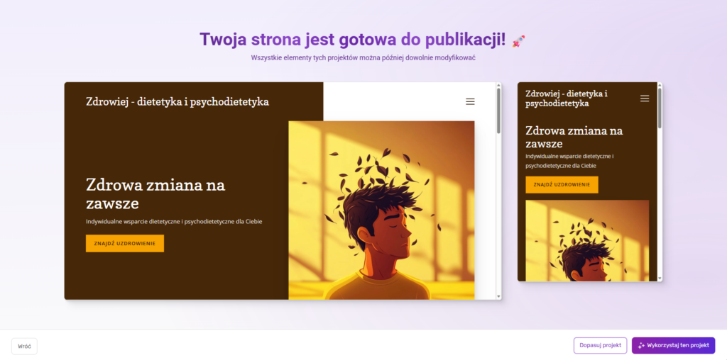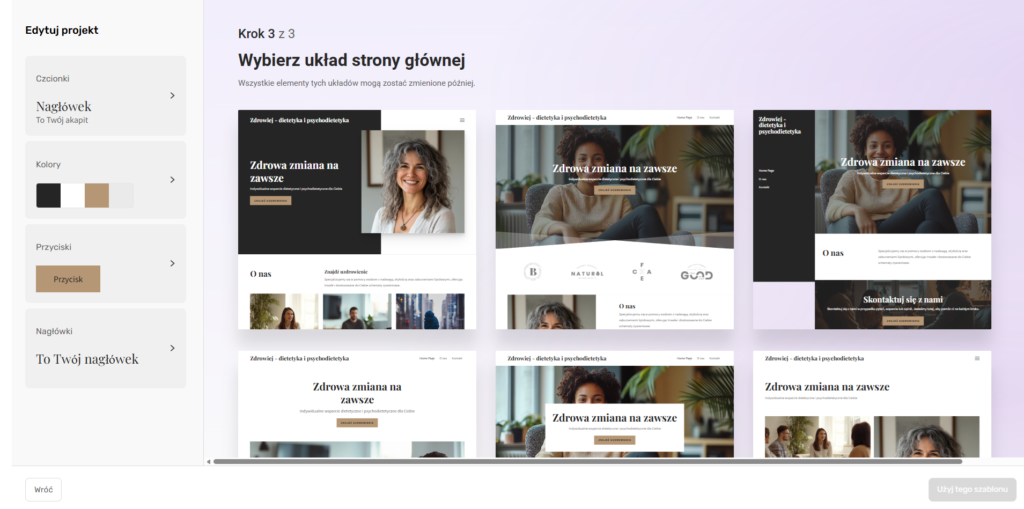 Po wyborze grafik zobaczysz różne układy stron – klikając wybrany, zobaczysz jak strona będzie wyglądać na komputerze i urządzeniu mobilnym; możesz też dostosować paletę kolorystyczną, wygląd przycisków czy fonty. Wybierz szablon, który podoba Ci się najbardziej – teraz możesz już rozwijać swoją stronę.