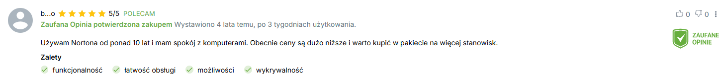 Jednym z kluczowych aspektów przy wyborze oprogramowania antywirusowego może być opinia o produkcie. Ważne jest jednak to, aby jakakolwiek ocena lub komentarz pochodziły od rzeczywistego klienta, który zakupił produkt z wiarygodnego źródła. Z tego też względu warto przy sprawdzaniu opinii w sieci kierować się ocenami, które zostały potwierdzone właśnie zakupem.