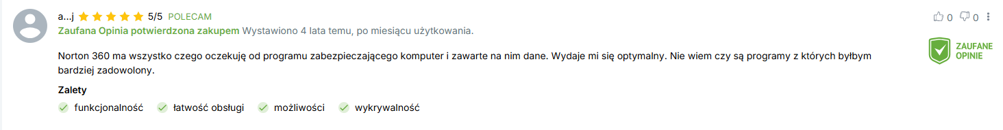 W przypadku Nortona 360 wzięliśmy pod uwagę głosy klientów z serwisu Ceneo, w którym znajdziesz również nasz sklep home.pl. Każda recenzja pochodzi tam bowiem od użytkownika, który otrzymał po zakupie swój specjalny link do umieszczenia opinii.