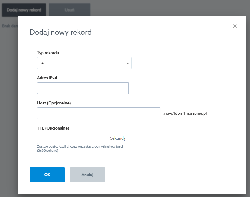 - TTL (opcjonalne): możesz zostawić puste i korzystać z domyślnej wartości (3600 sekund).