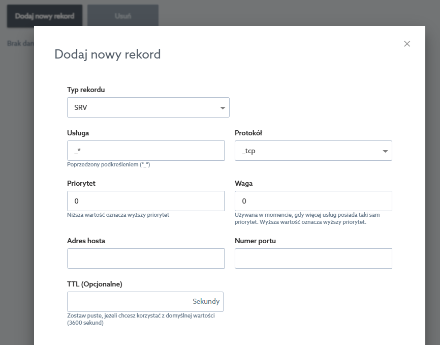 Musisz utworzyć dwa nowe rekordy: rekord A i rekord SRV.