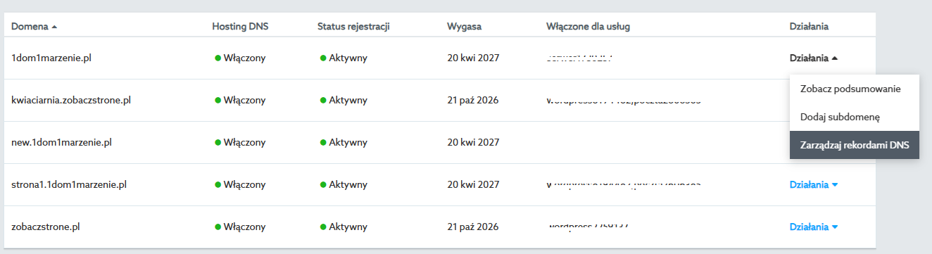 Przejdź do menu Domeny w panelu home.pl. Zobaczysz listę wszystkich swoich domen. Wybierz tę, którą chcesz przypisać do serwera Minecraft i przejdź do menu Działania, a następnie Zarządzaj rekordami DNS. Każda domena ma różne rekordy DNS – odpowiadają one m.in. za przypisanie domeny do konkretnego serwera. Jeśli już używasz tej domeny do strony WWW, prawdopodobnie istnieje już rekord typu A.