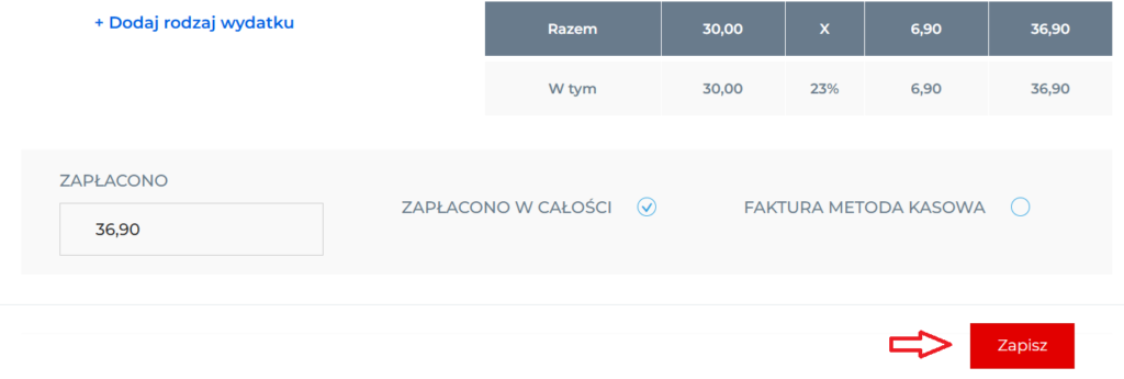 - Po wprowadzeniu wszystkich informacji kliknij przycisk Zapisz, aby dodać wydatek do systemu.