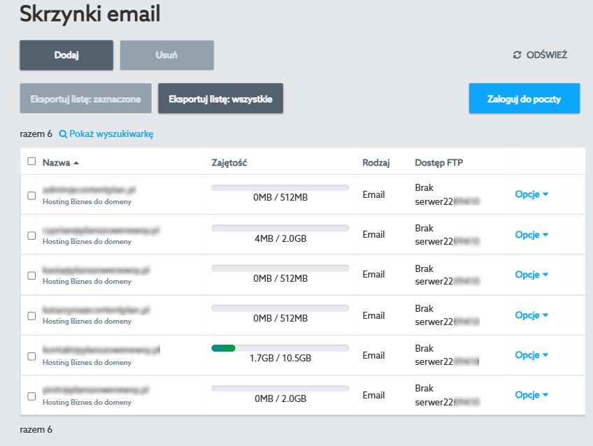 Na ekranie zostanie wyświetlona lista skrzynek e-mail, które są w tej chwili utworzone na wybranym serwerze (hostingu) w home.pl.