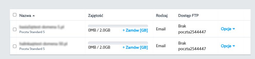 - Nazwa – pod nazwą każdej skrzynki znajdziesz informację, z którą usługą jest powiązana (pocztową lub hostingową)