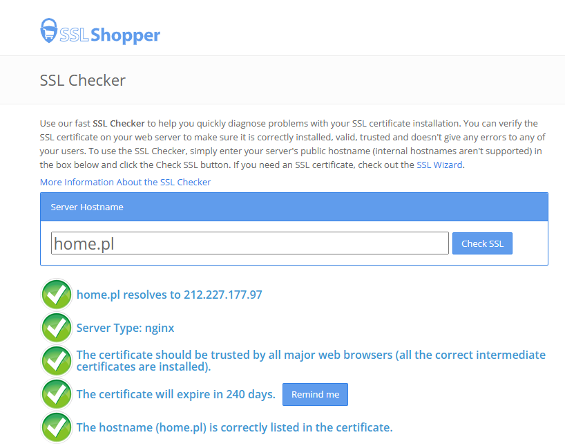 Skorzystaj z zewnętrznych narzędzi diagnostycznych. Najbardziej wiarygodnym sposobem jest użycie niezależnego skanera, takiego jak SSL Checker (np. na stronie sslshopper.com). Wystarczy wpisać adres domeny, a narzędzie sprawdzi poprawność łańcucha certyfikatów oraz datę ich ważności.