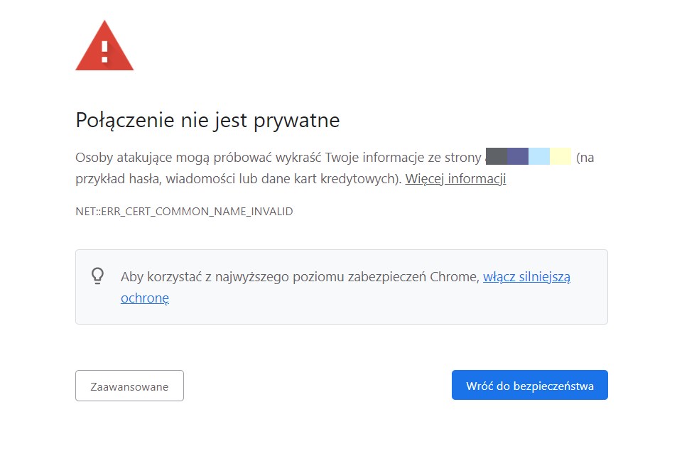 - NET::ER_CERT_COMMON_NAME_INVALID – certyfikat nie pasuje do adresu domeny.