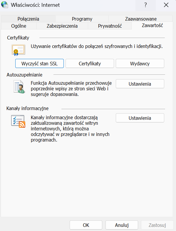 W systemie Windows (11/12) wpisz w wyszukiwarkę systemową Opcje internetowe, przejdź do zakładki Zawartość i kliknij przycisk Wyczyść stan SSL. To natychmiast odświeży pamięć certyfikatów dla wszystkich przeglądarek korzystających z systemowego magazynu.
