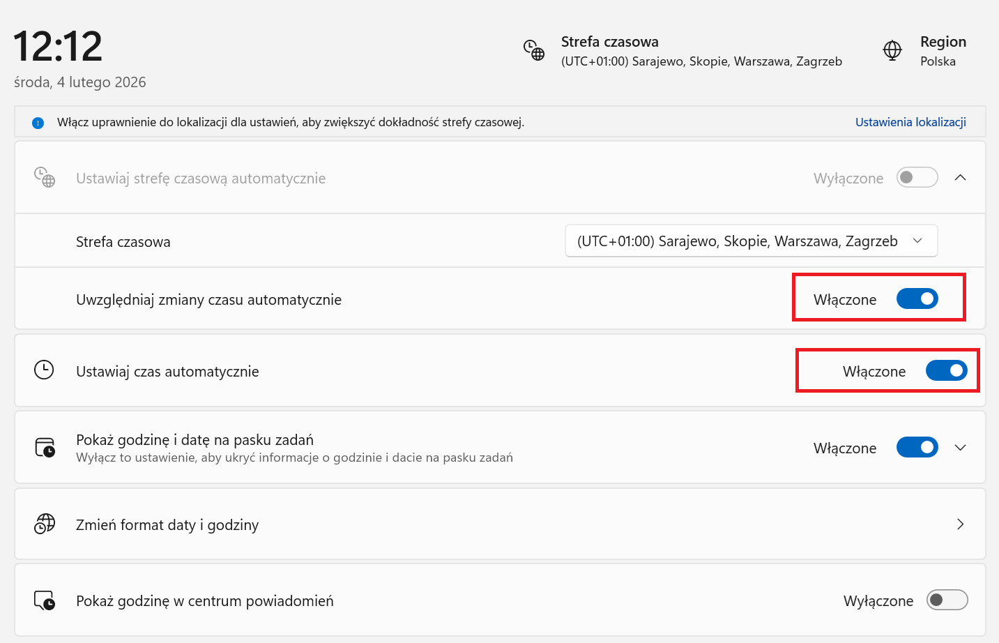 - W Windows 11/12: Wejdź w Ustawienia > Czas i język > Data i godzina. Upewnij się, że opcje Ustawiaj czas automatycznie oraz Ustaw strefę czasową automatycznie są włączone. Kliknij przycisk „Synchronizuj teraz”, aby wymusić połączenie z serwerem czasu.
