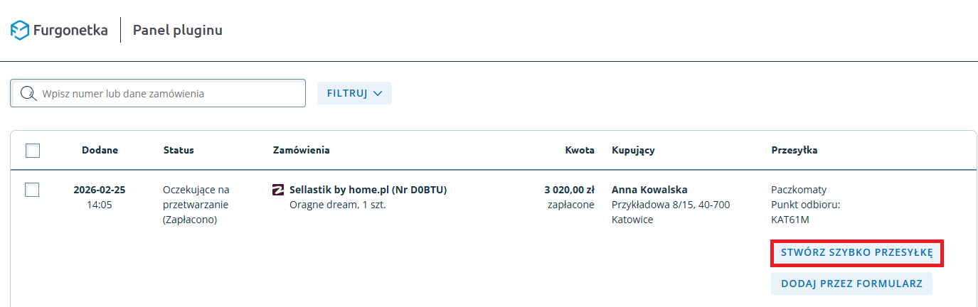 - Kliknij „Stwórz szybko przesyłkę” przy wybranym zamówieniu.